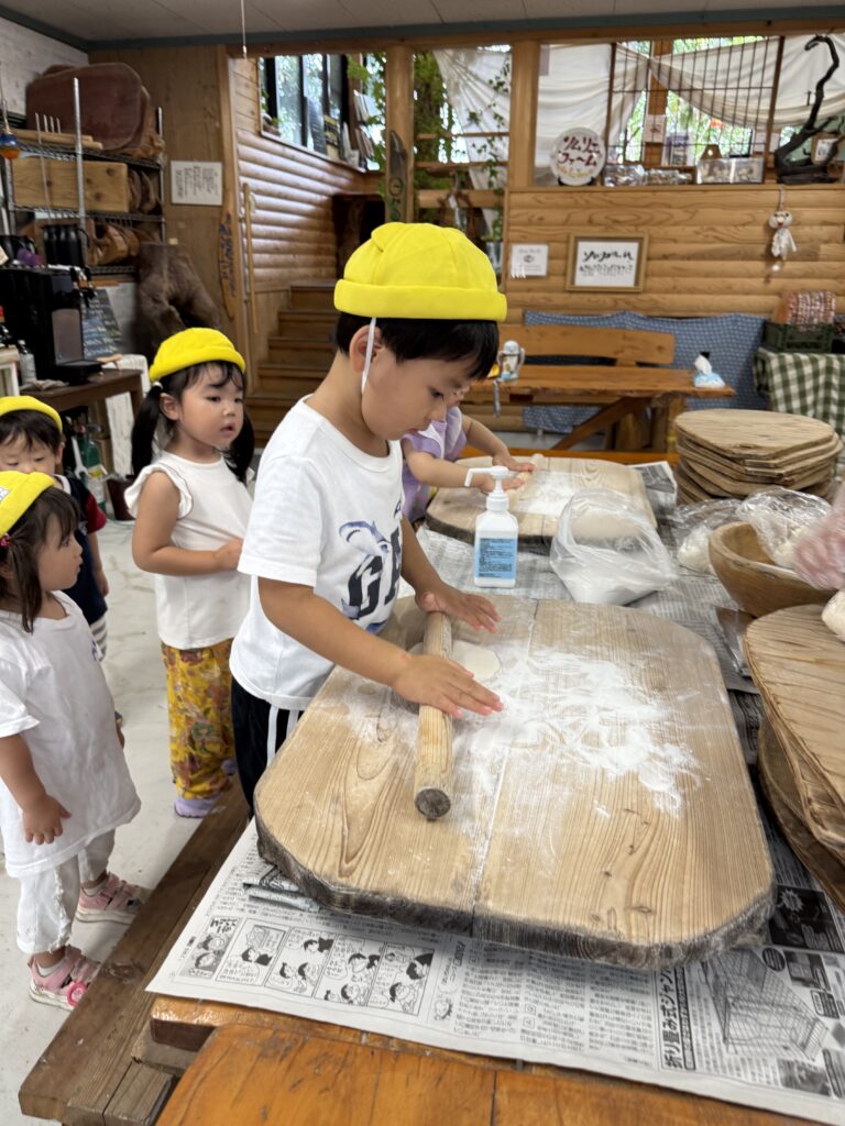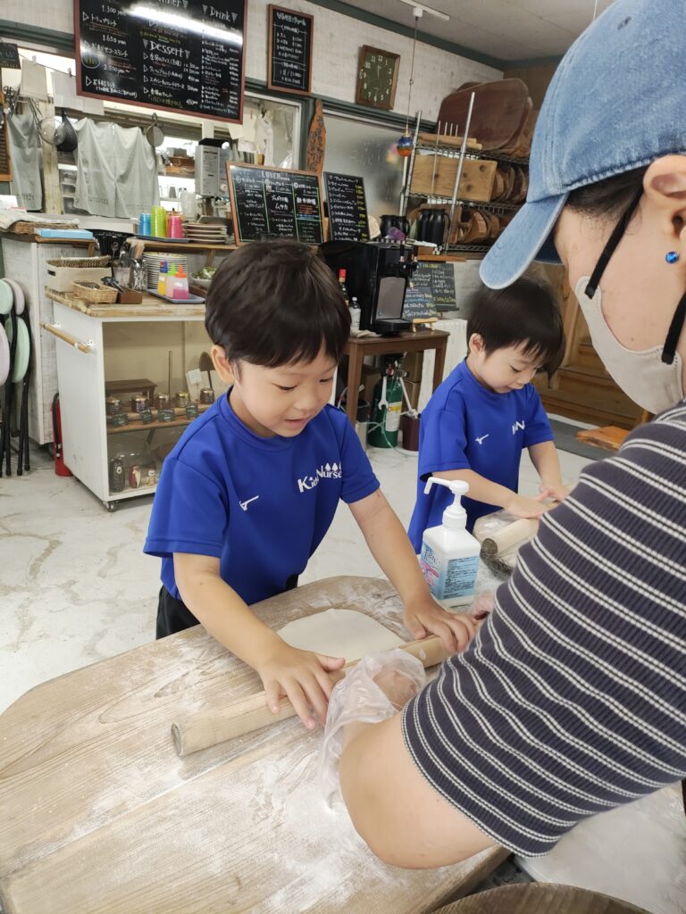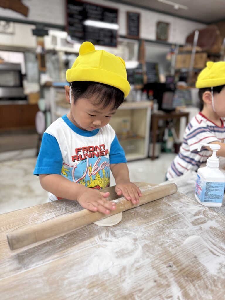 今年初めてのくま組さんも、毎日のようにピザの歌を歌い、ピザの生地をのばす練習をしていた成果が出たのか、とても上手に生地をのばすことが出来ていました👏