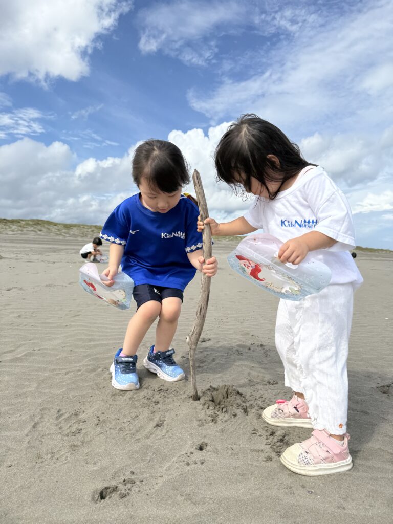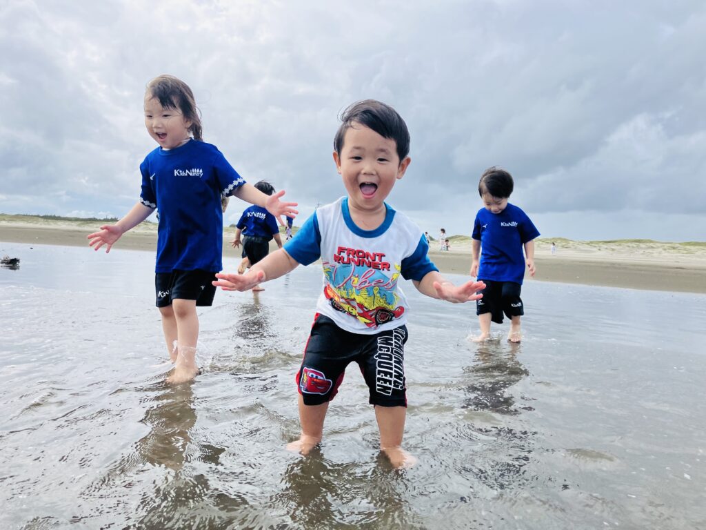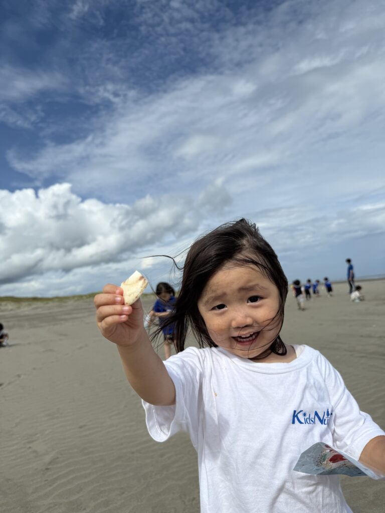 来年のサマーキャンプを心待ちにしている、くま組さん一同は、憧れの海に走っては行かず、貝殻拾いに夢中になっていました😀