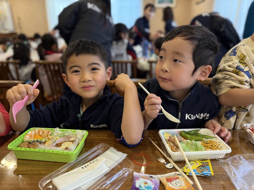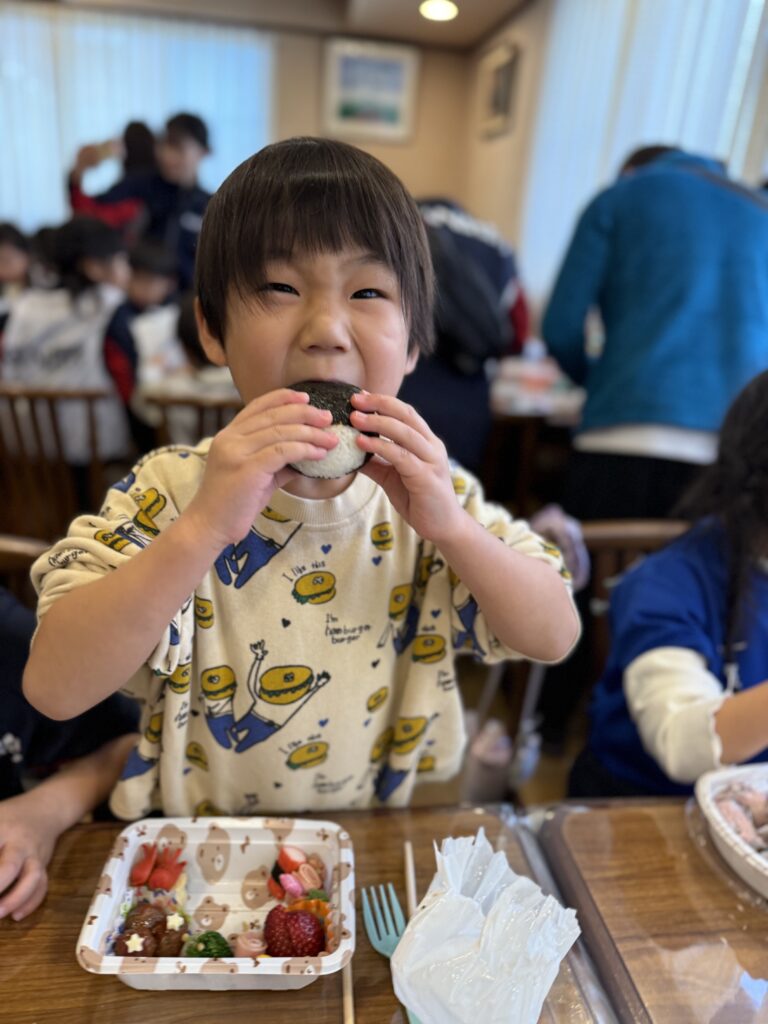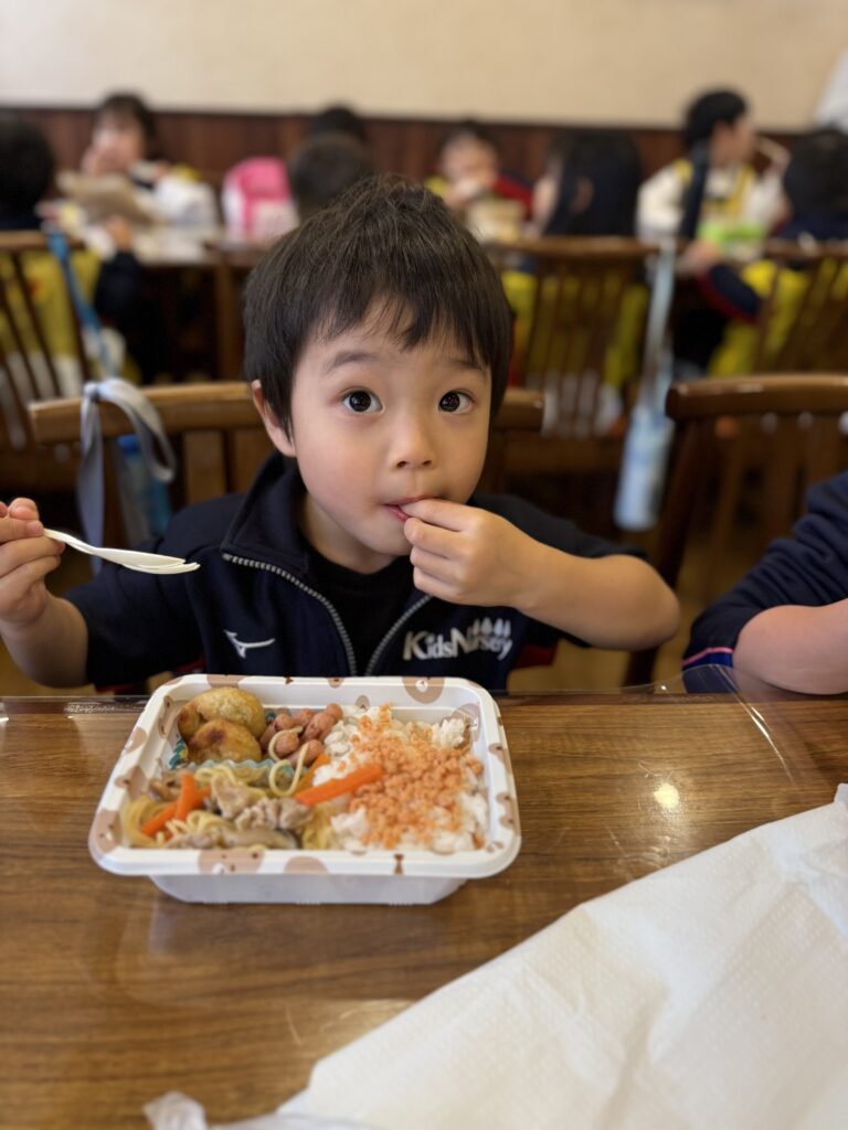 保護者の皆様が用意してくれたお弁当をとても美味しそうに食べていました😋