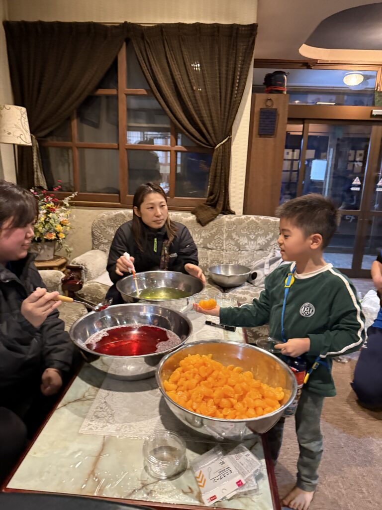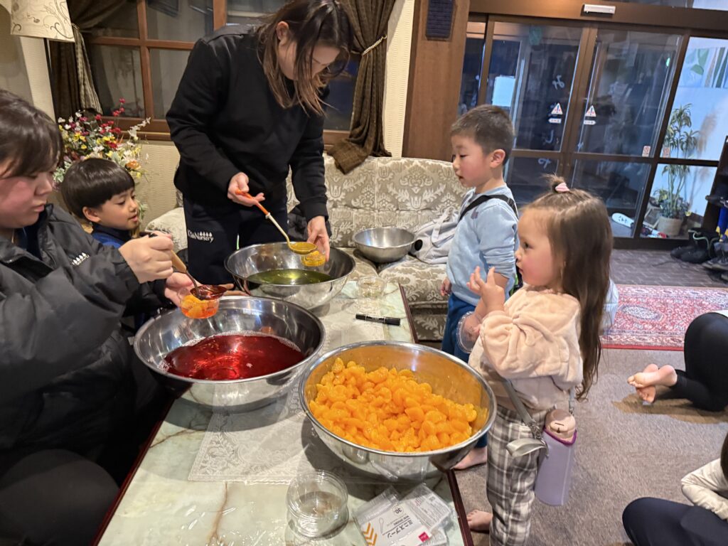 お弁当を食べ、元気いっぱいになった後は、たくさん雪遊びをして、お風呂に入った後は、大好きなカレーをお腹いっぱい食べ、翌朝のデザートのゼリーを作りました☺️